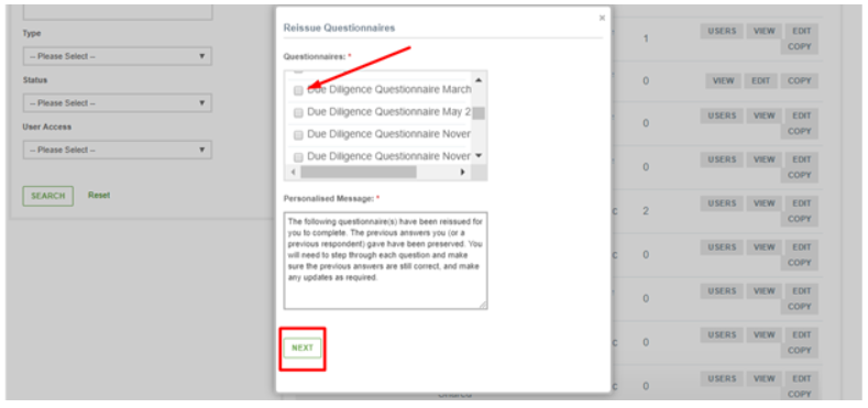 When you click that, the following window pops up. In it you have to select the questionnaire you want to reissue by ticking the corresponding box and then click the Next button.